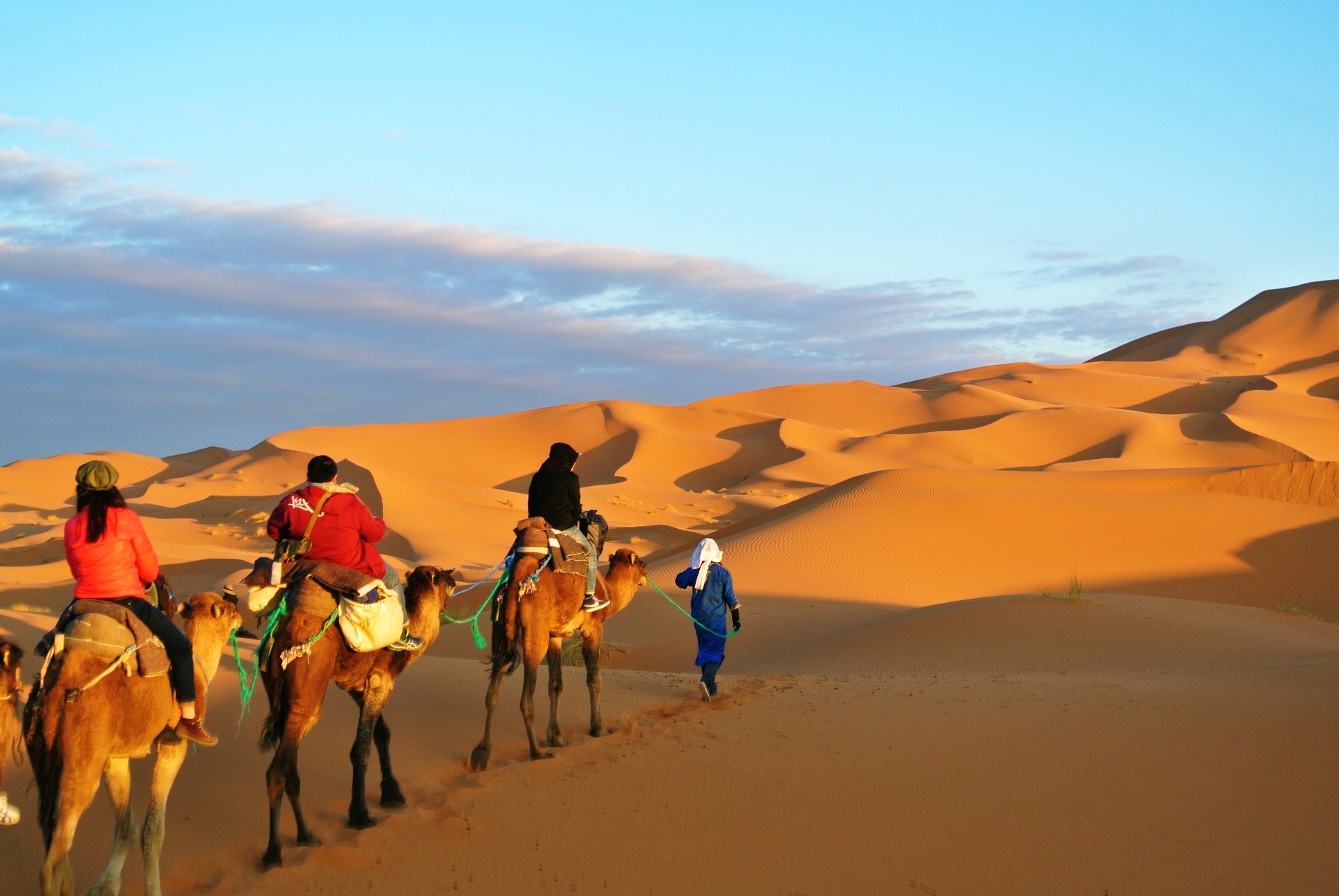 A break is planned to enjoy a tea accompanied by a percussion of drums of Castanets, then return to the inn for lunch, free time until the time of the departure by camels through the vast expanse of golden sand in enjoying the beautiful scenery offered by the sunset, enjoy the desert spirit with an indescribable starry sky as rarely seen. Dinner and accommodation under nomad tents.