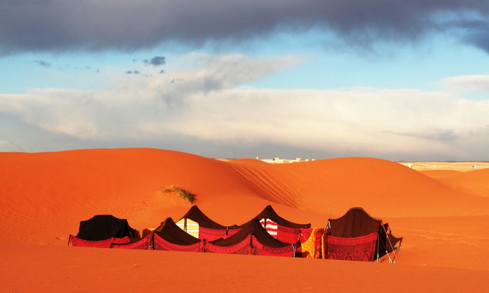 We woke up before dawn to watch the sunrise. Return in dromedary to the lodge. Shower and breakfast. We leave to go around the Erg Chebbi, an expanse of sand desert where the Great Dune of Morocco is located, of more than 250 meters of altitude, connecting by track with part of the route followed by the old Paris-Dakar, with the mountains that limit with Algeria in the background. Stop at the oasis of Tissardmin and continue to a nomadic settlement where we will know some secrets of his life and customs. Later stop at a panoramic point where you can contemplate the Erg Chebbi as a whole. Stop in Khamlia, the original village of Mali, where you can relax with a tea while enjoying a small gnawa music concert. Return to the hotel, lunch and free afternoon to climb the dunes and take advantage of a romantic sunset. After dinner, a Berber show with drums awaits us. Dinner and accommodation